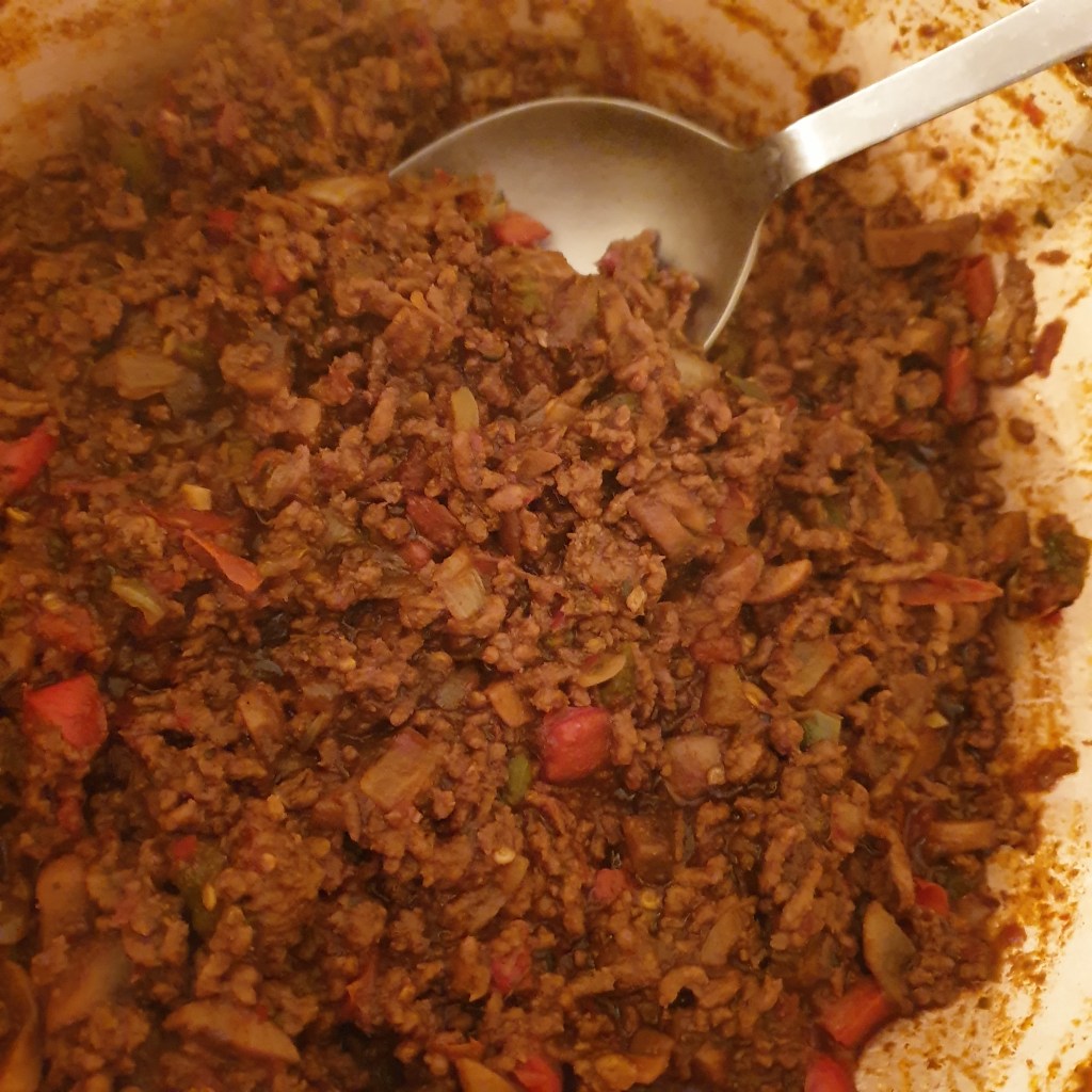 1. Finely chop onion, peppers, garlic and mushrooms and sweat off with a tbsp of olive oil until softened.